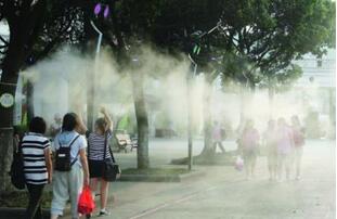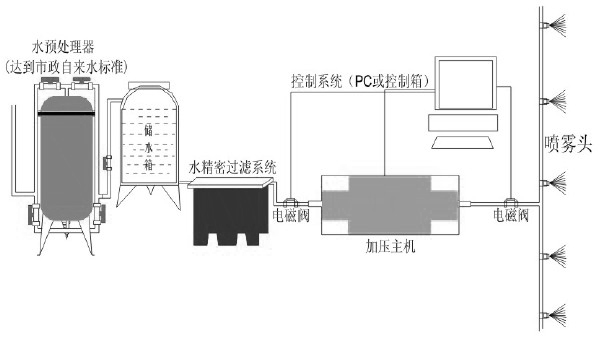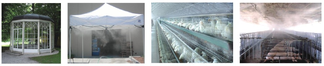 其原理是凈化過濾后的水進行加壓至50kg以上,通過高壓輸水管道送達(dá)特殊結(jié)構(gòu)的噴頭,噴出霧粒粒徑微米級的霧團,漂浮彌漫于環(huán)境空間,利用空氣的不飽和性和水的蒸發(fā)散熱原理,快速蒸發(fā)吸收環(huán)境空間的熱量,使得環(huán)境空間氣溫得到降低,空氣濕度得到增大。通過對其噴霧時間及噴霧量的不同控制,有效的改善各種環(huán)境及空間的空氣溫度及質(zhì)量。