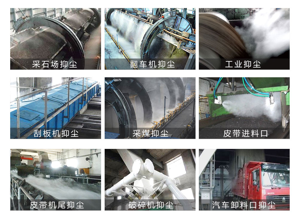 噴霧除塵系統(tǒng)是一種新興的除塵降塵技術,其原理就是噴霧產(chǎn)生非常細小的微粒,由于表面張力基本上為零,被噴灑到空氣中能迅速吸附空氣中的灰塵顆粒,形成有效控塵。