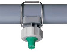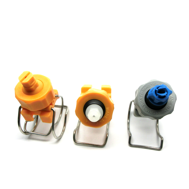 根據(jù)扇形噴嘴的螺紋規(guī)格,把噴嘴與底座連接好,在水管上開個小孔,選擇卡扣的內(nèi)徑與水管一致,直接用手把彈簧卡扣在水管上,水管與噴嘴底座之間用密封圈密封,不會滲漏。