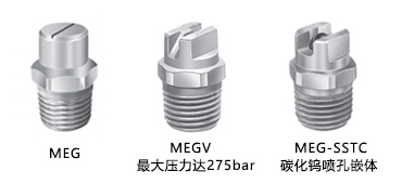 MEG-SSTC型扇形噴嘴具有與標(biāo)準(zhǔn)的MEG噴嘴相同的性能,并帶有碳化鎢嵌體,從而提供了很好的耐磨性。