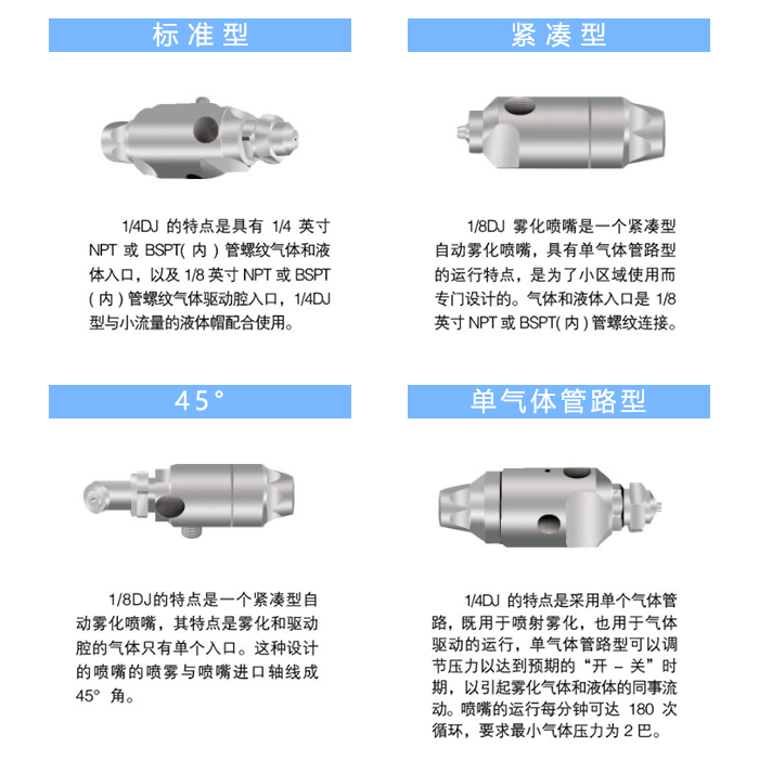• 每次“開(kāi)/關(guān)”運(yùn)行只切斷噴霧器的液體部分。 • 送到噴嘴的液體流可以通過(guò)虹吸或重力傳送,也可通過(guò)壓力傳送。 • 噴霧裝置可選種類(lèi)繁多,適用于各種流量和噴霧形狀。 • 二流體的共同特點(diǎn):利用壓縮空氣高速流動(dòng)的原理使液體變微?;?。 |
